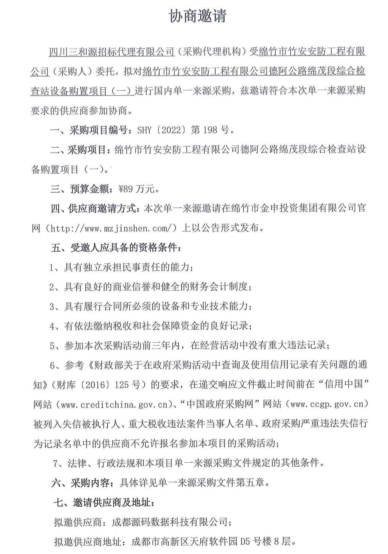 德阿公路綿茂段檢查站設備購置項目(一)協(xié)商邀請公告