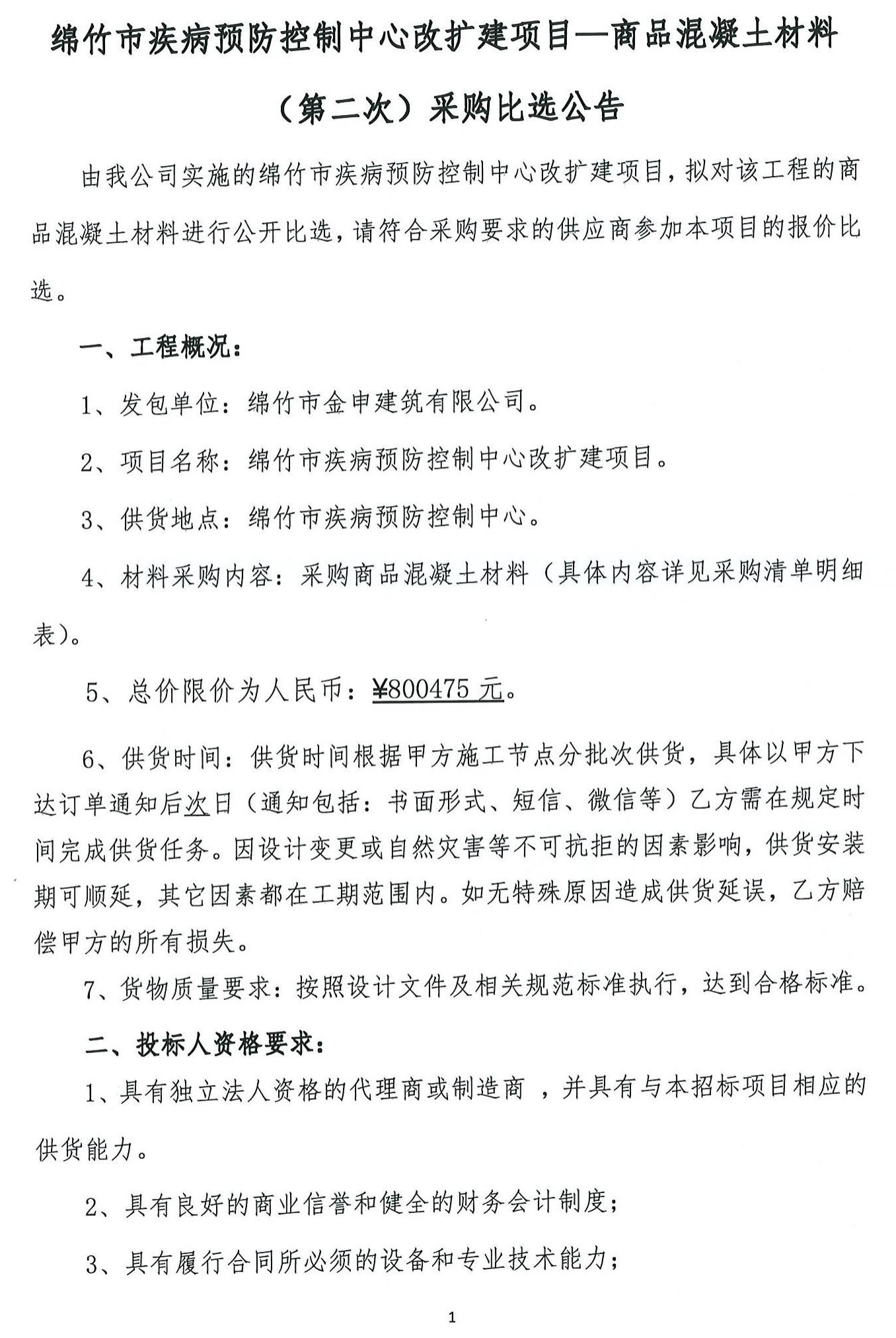 綿竹疾病預防中心改擴建項目(商品混凝土)第二次比選公告
