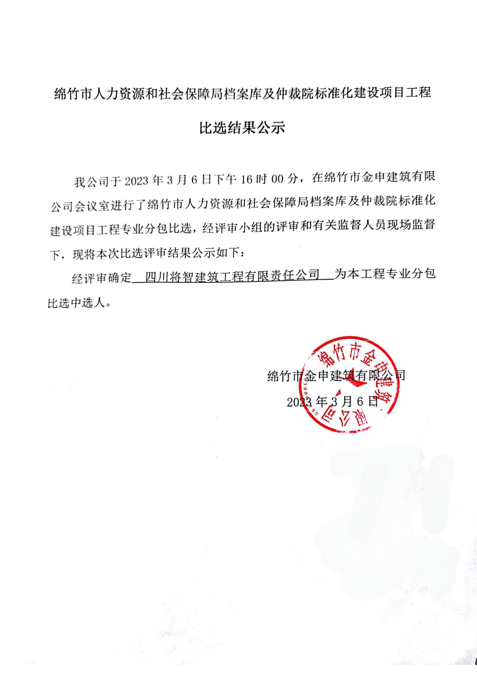綿竹人社局檔案庫及仲裁院標準化建設項目比選結果公示