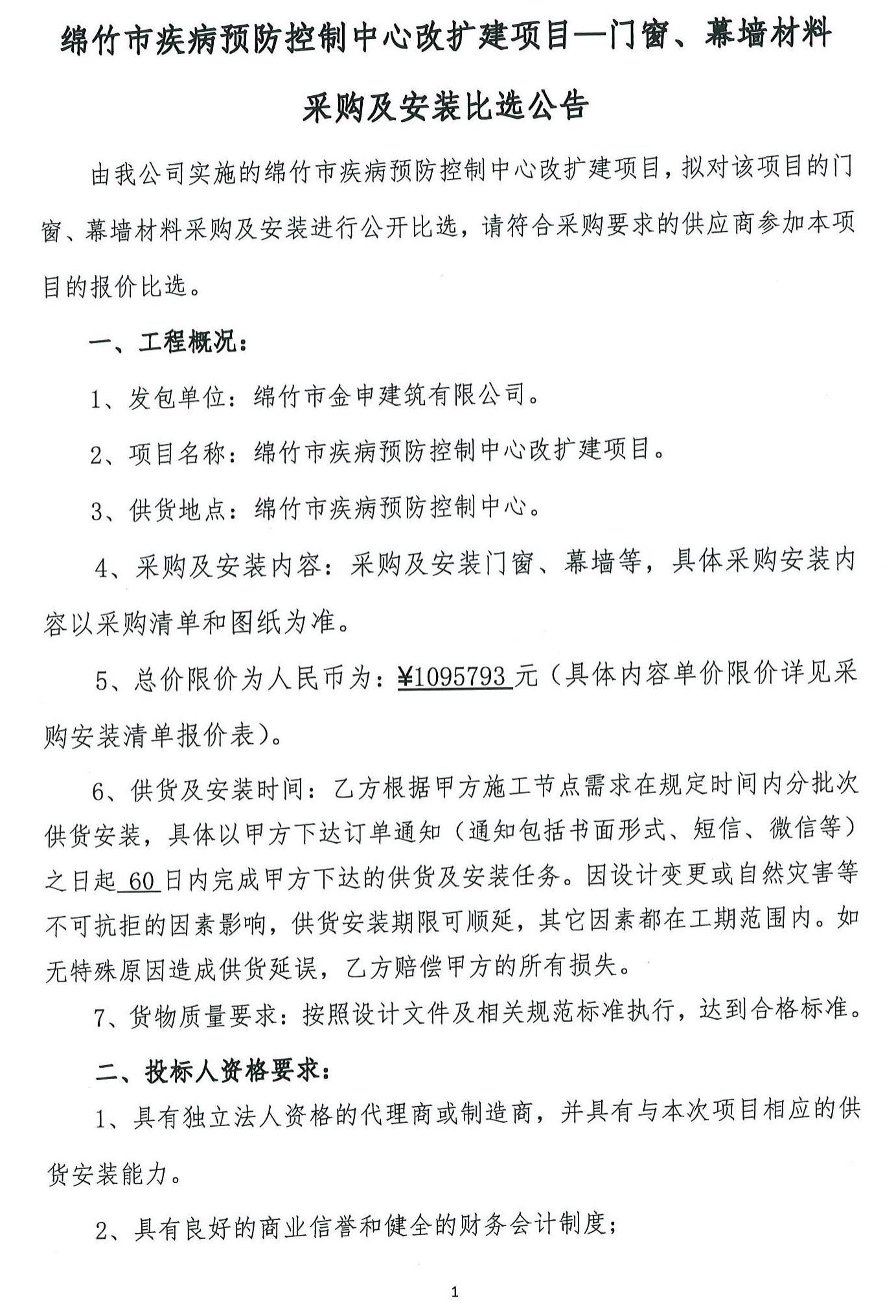 綿竹市疾病預防控制中心改擴建項目門(mén)窗幕墻采購比選公告