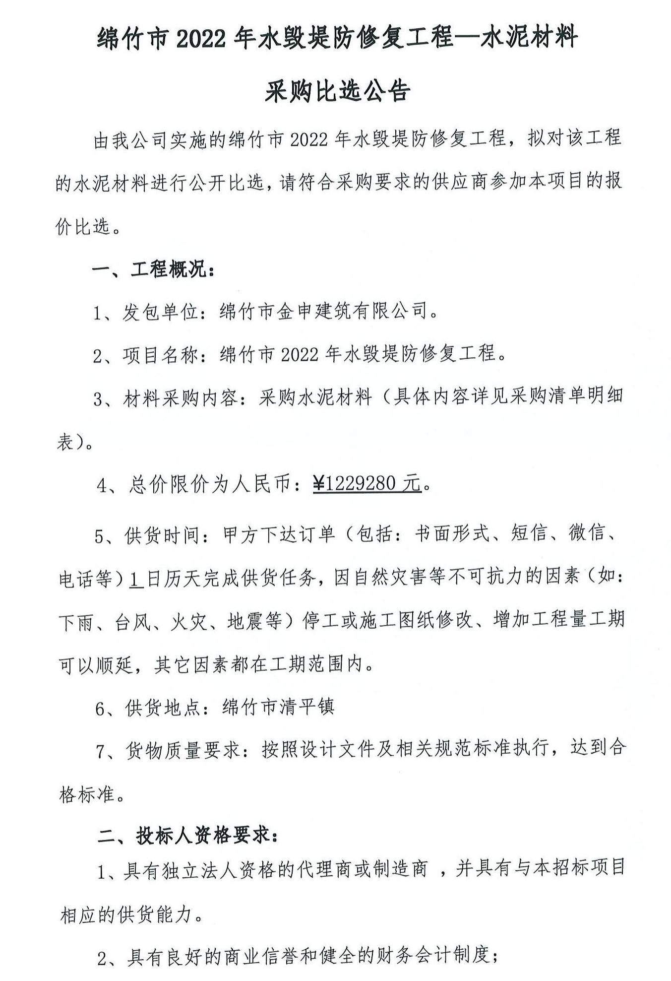 綿竹市2022年水毀堤防修復工程-水泥材料采購比選公告