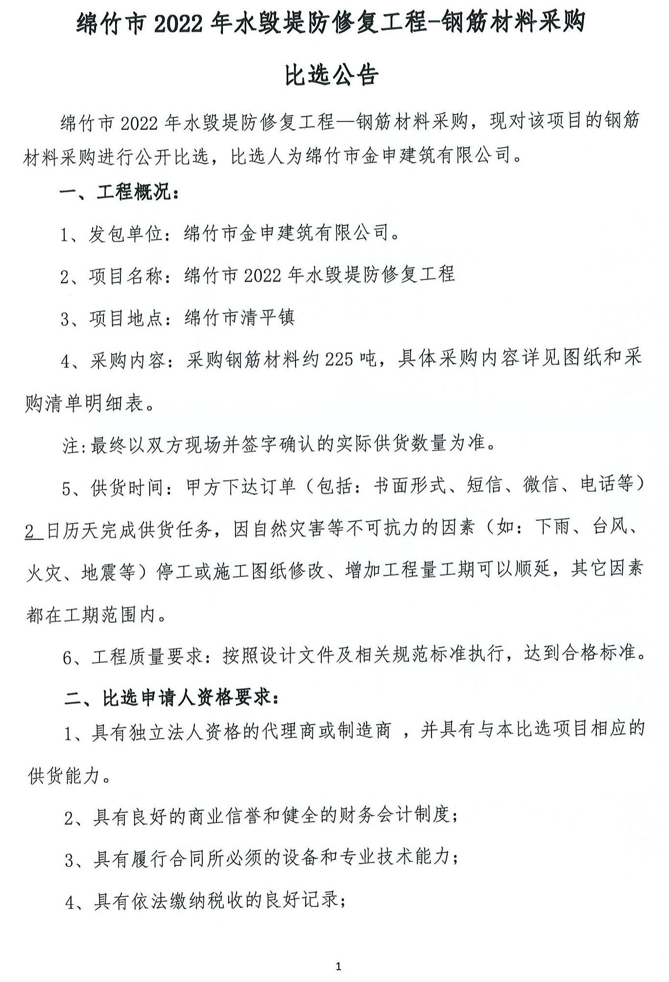 綿竹市2022年水毀堤防修復工程-鋼筋材料采購比選公告