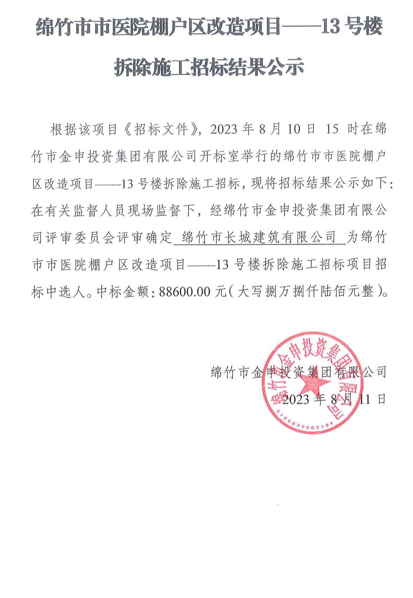 綿竹市市醫院棚戶(hù)區改造項目-13號樓拆除施工招標結果公示