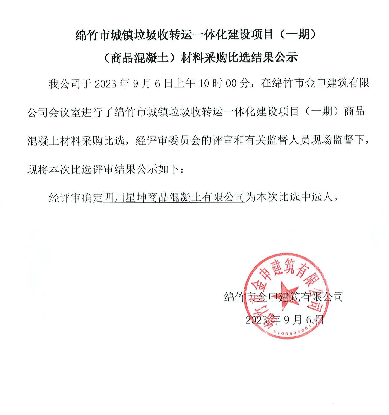 城鎮垃圾收轉運一體項目(一期)商品混凝土比選結果公示