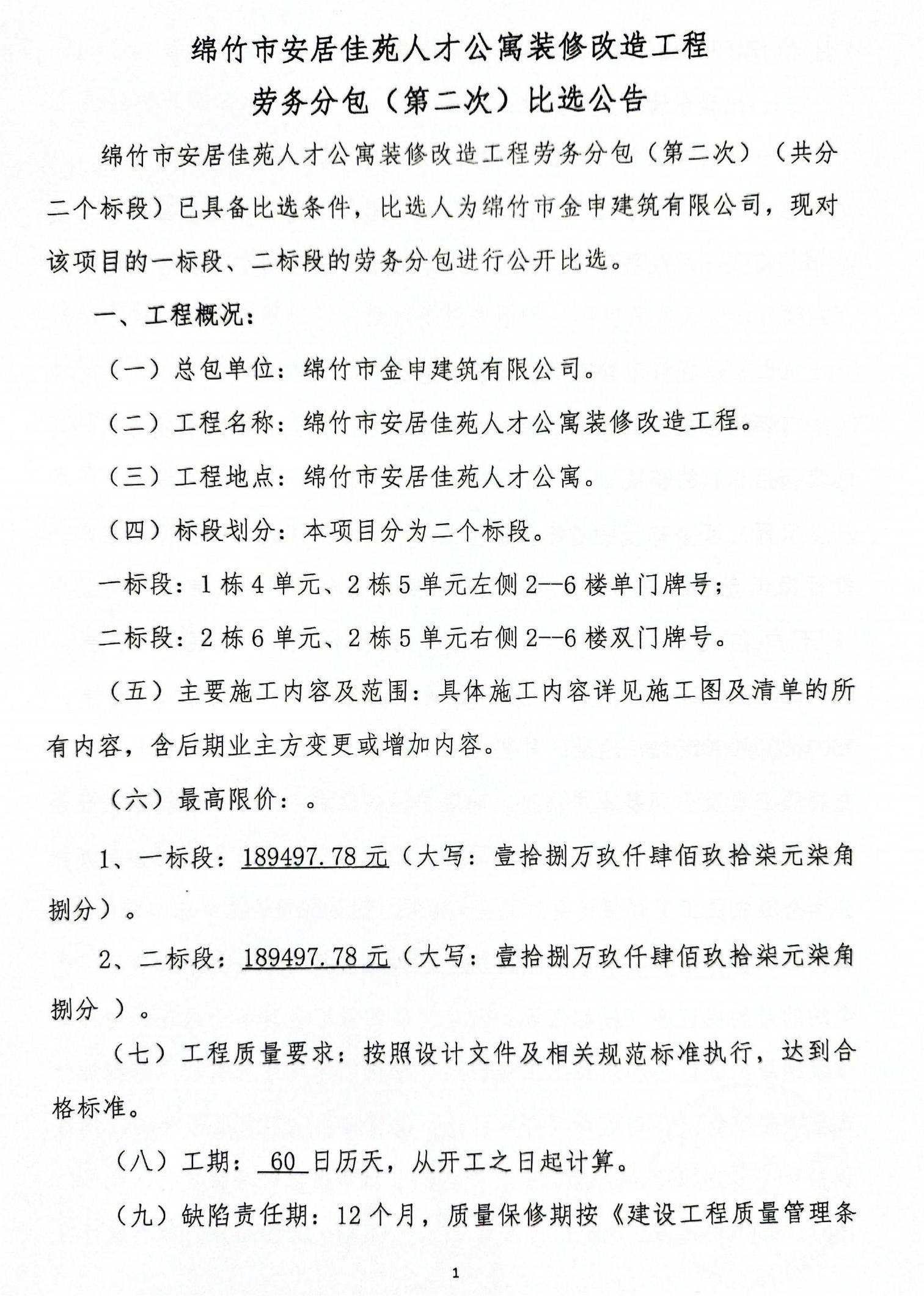 安居佳苑人才公寓裝修改造工程(第二次)勞務(wù)比選公告