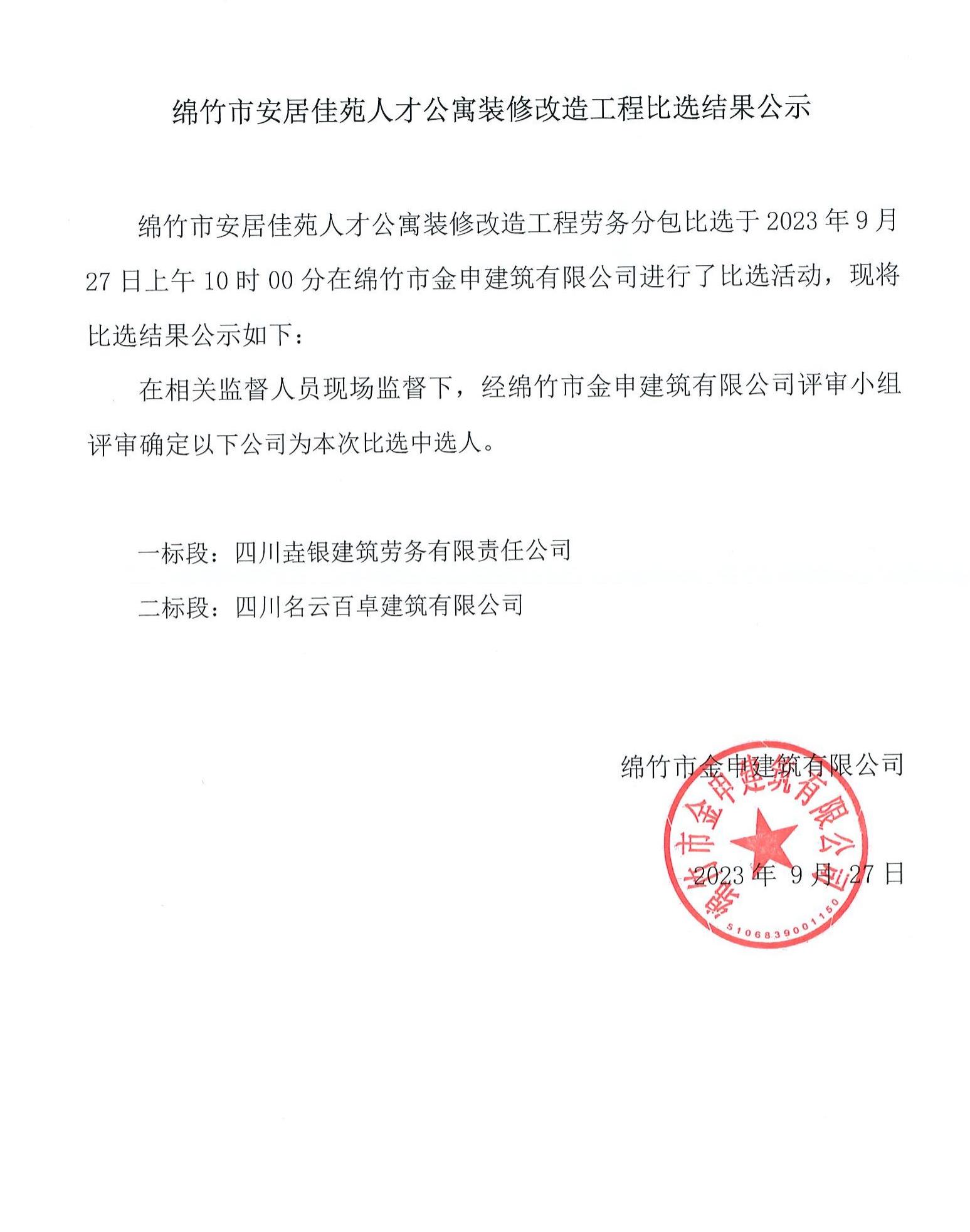 綿竹市安居佳苑人才公寓裝修改造工程比選結果公示