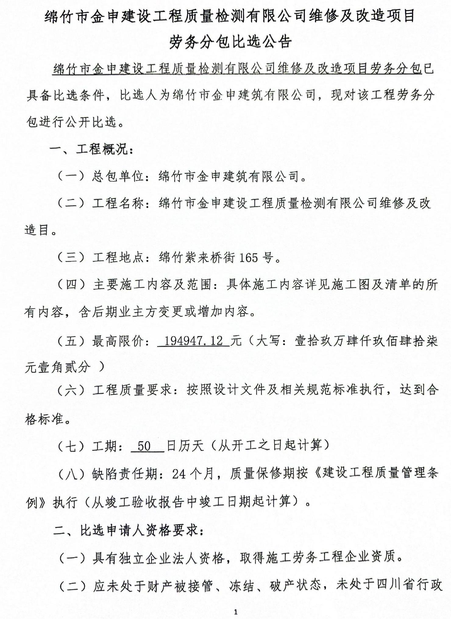 金申質(zhì)檢公司維修及改造項目勞務(wù)分包比選公告