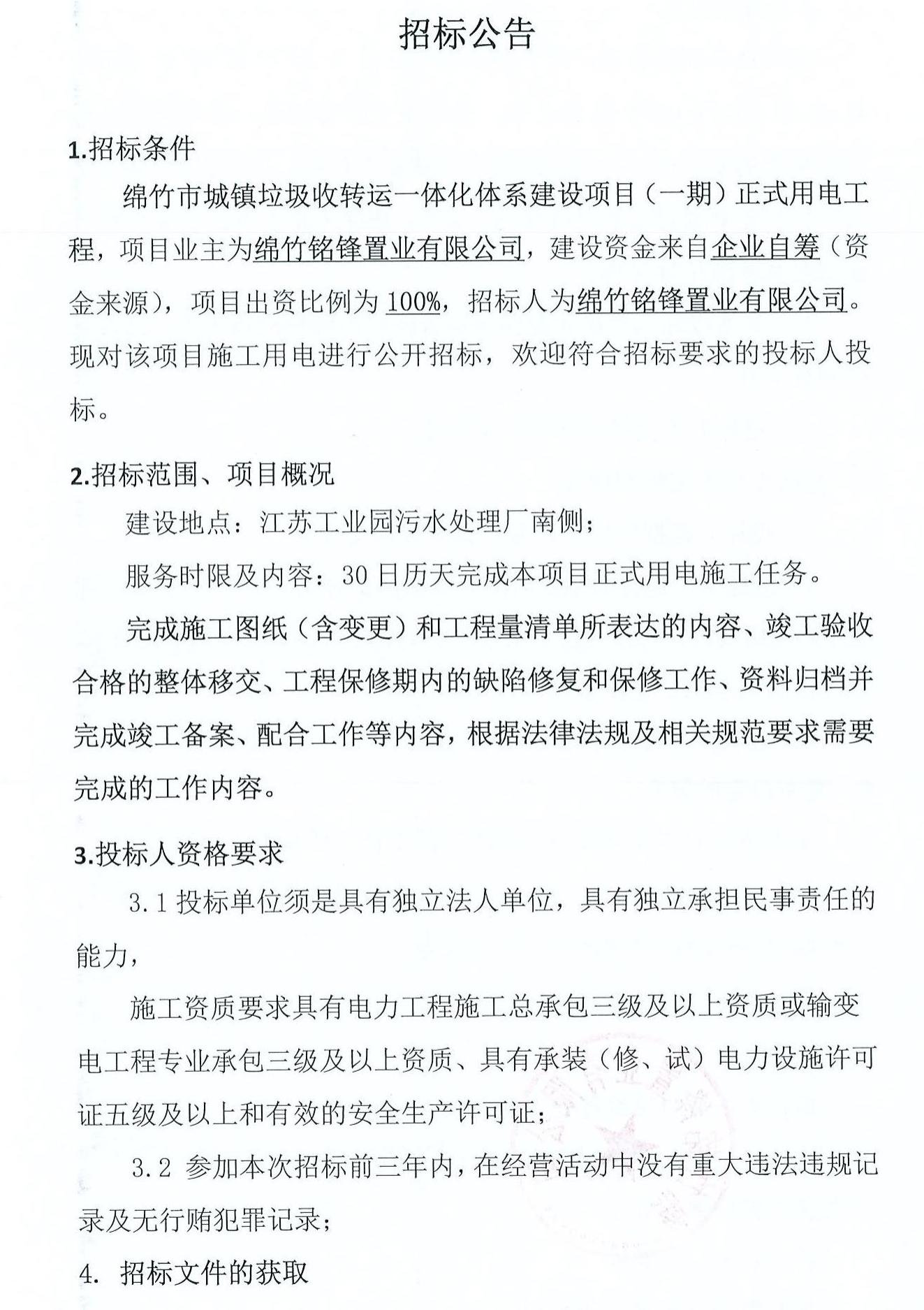 城鎮垃圾收轉運一體化建設項目(一期)正式用電招標公告