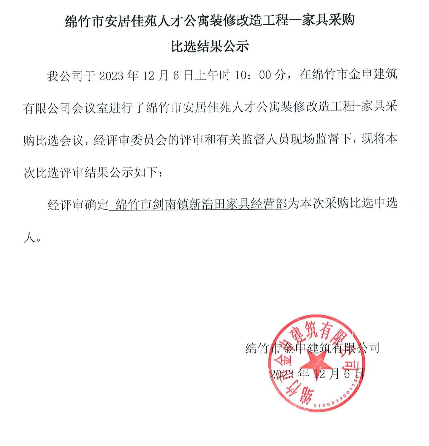 綿竹安居佳苑人才公寓裝修改造工程(家具采購)結果公示