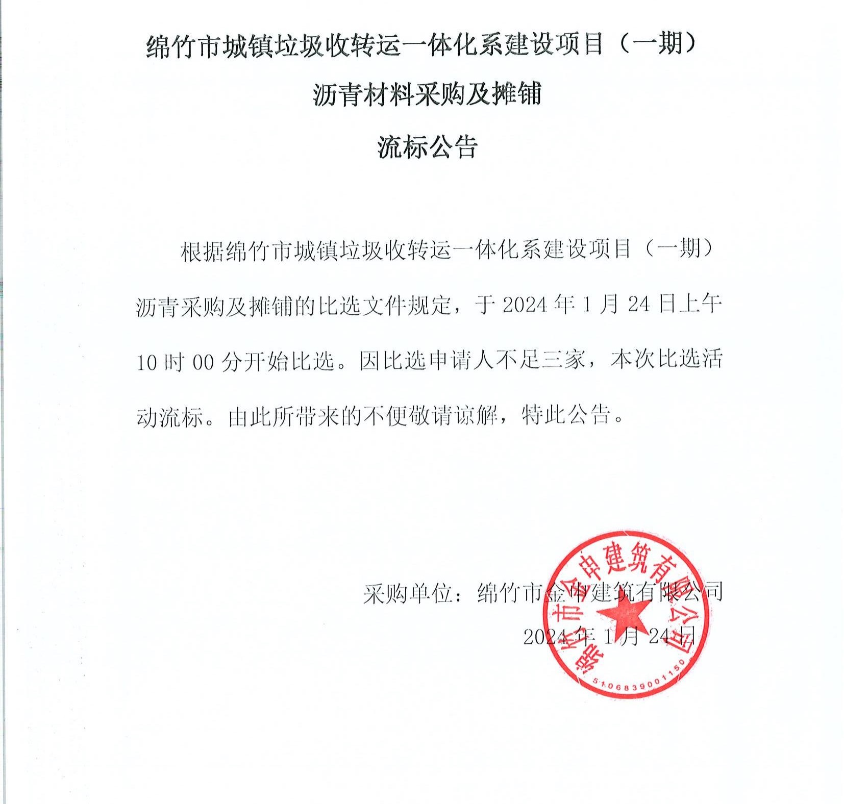 城鎮垃圾收轉運一體化建設(一期)瀝青材料采購流標公告
