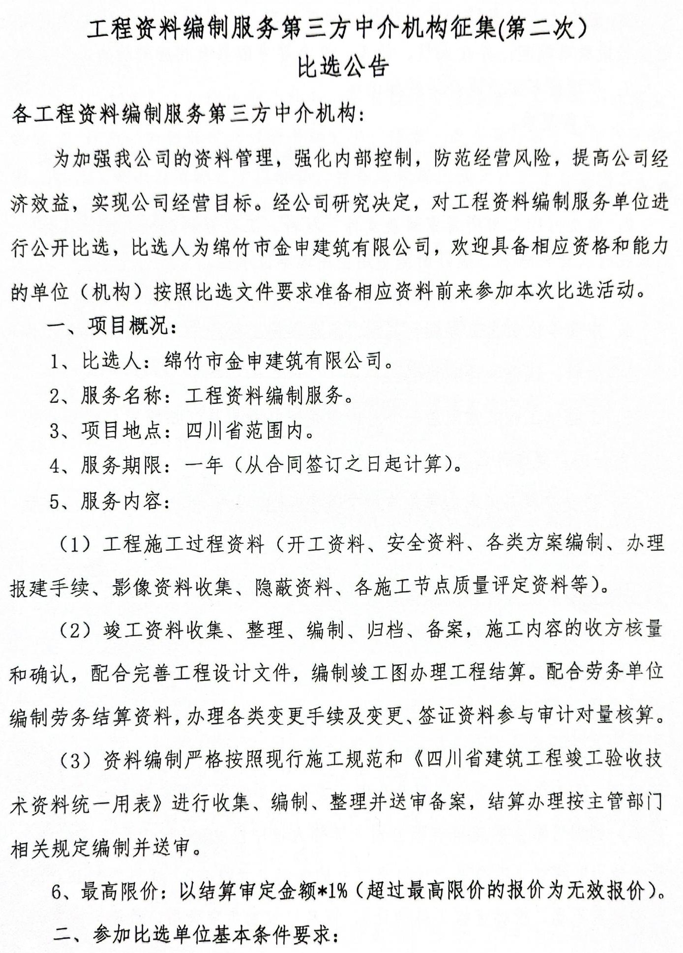 工程資料編制服務(wù)第三方中介機構征集(第二次)比選公告