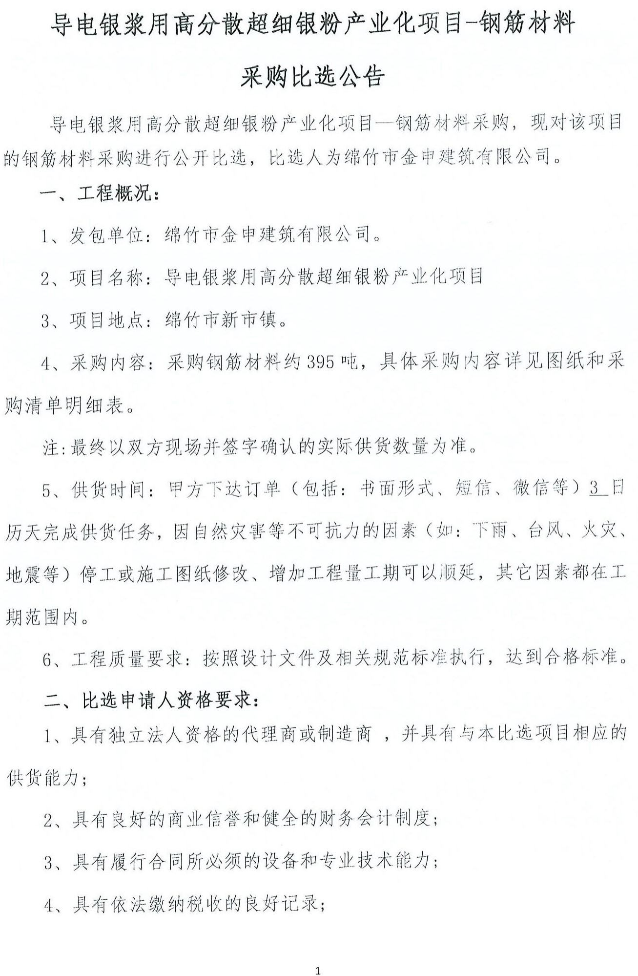 導電銀漿用高分散超細銀粉項目鋼筋材料采購比選公告