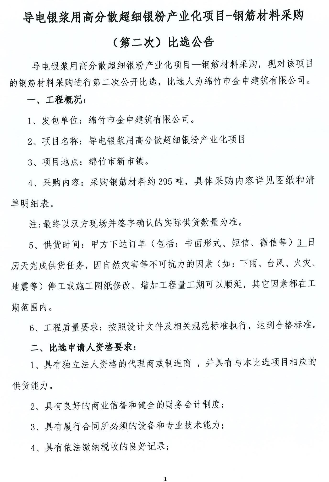 導電銀漿用高分散超細銀粉項目鋼筋材料第二次比選公告