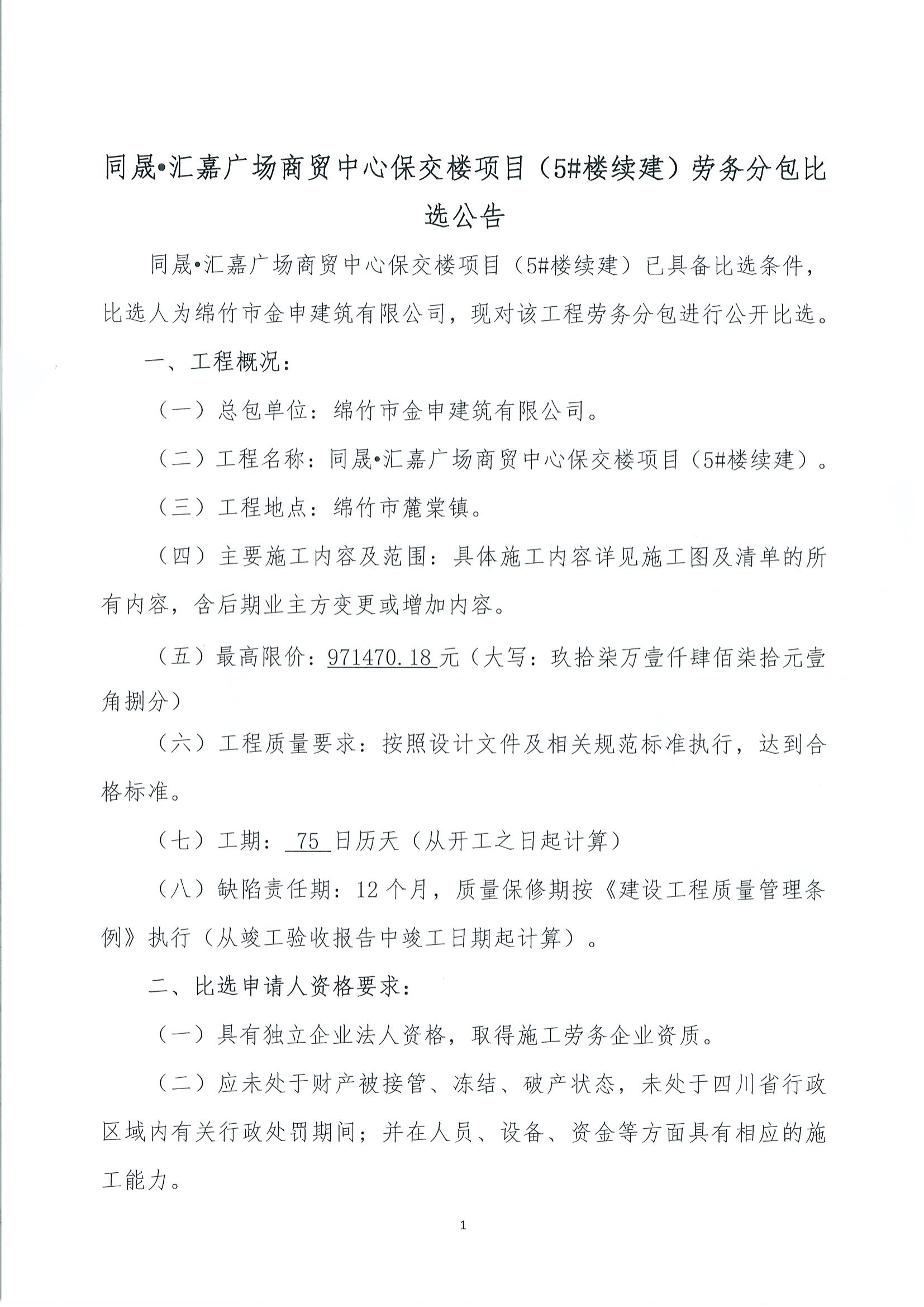 同晟·匯嘉廣場(chǎng)商貿中心保交樓(5#樓續建)勞務(wù)分包比選公告