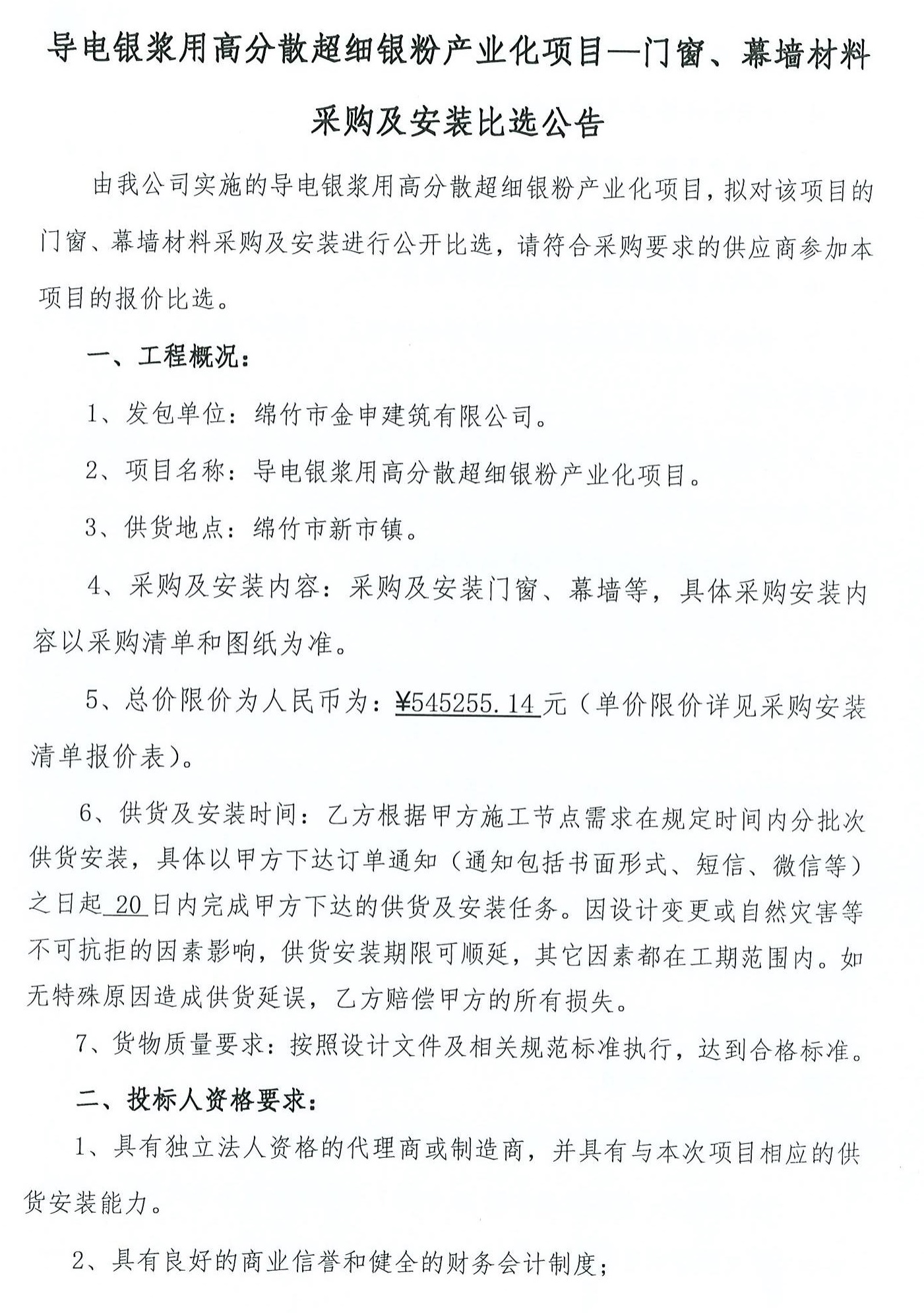 導電銀漿用高分散超細銀粉產(chǎn)業(yè)化項目—門(mén)窗幕墻比選公告