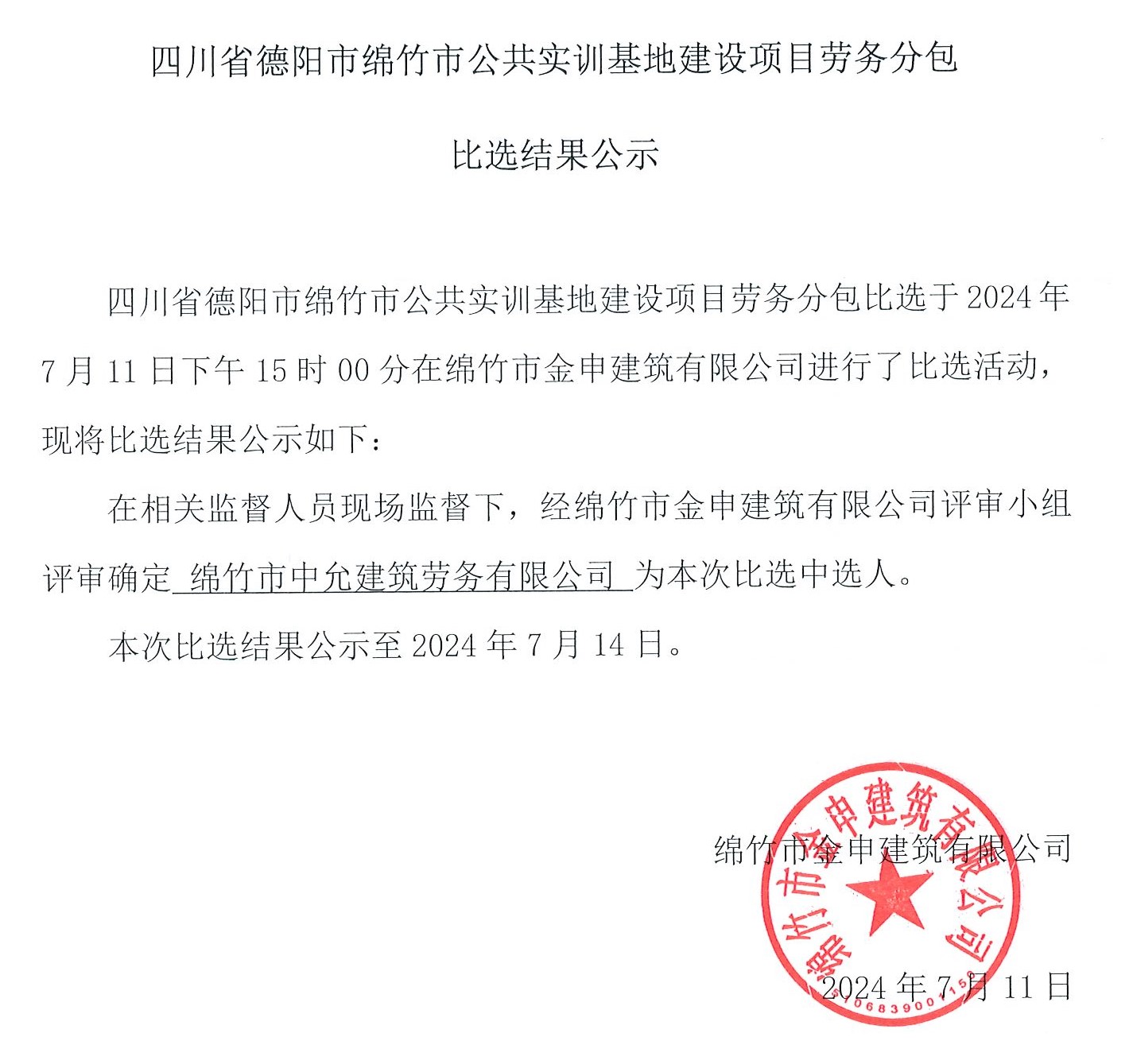 綿竹市公共實(shí)訓基地建設項目勞務(wù)分包結果公示