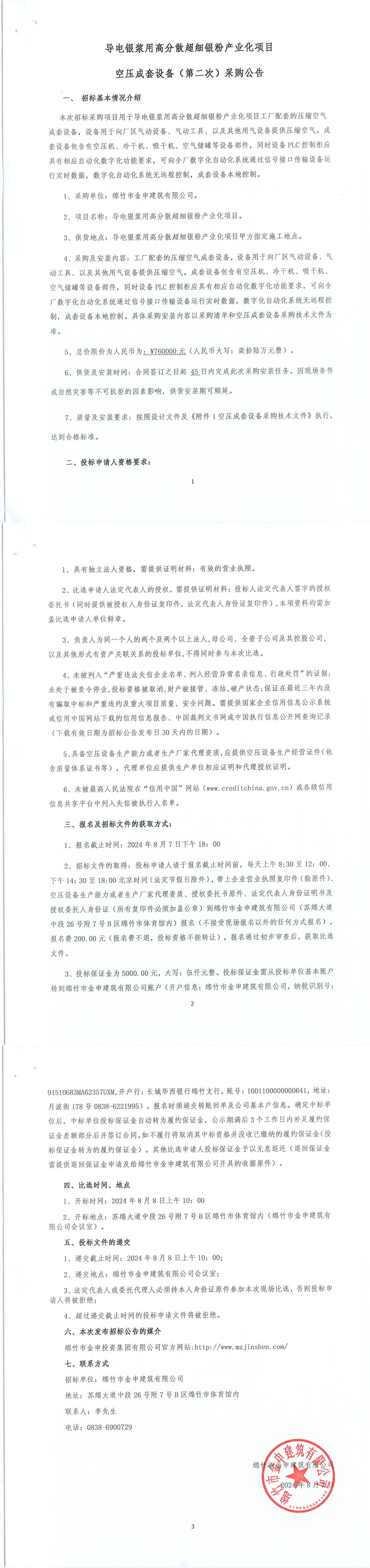 導電銀漿用高分散超細銀粉產(chǎn)業(yè)化項目空壓成套設備公告