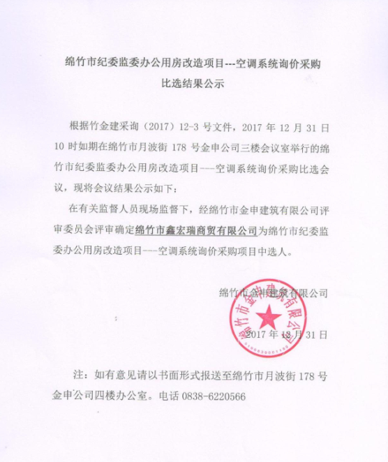 市紀委監委辦公樓改造項目--空調系統詢(xún)價(jià)采購比選結果公示