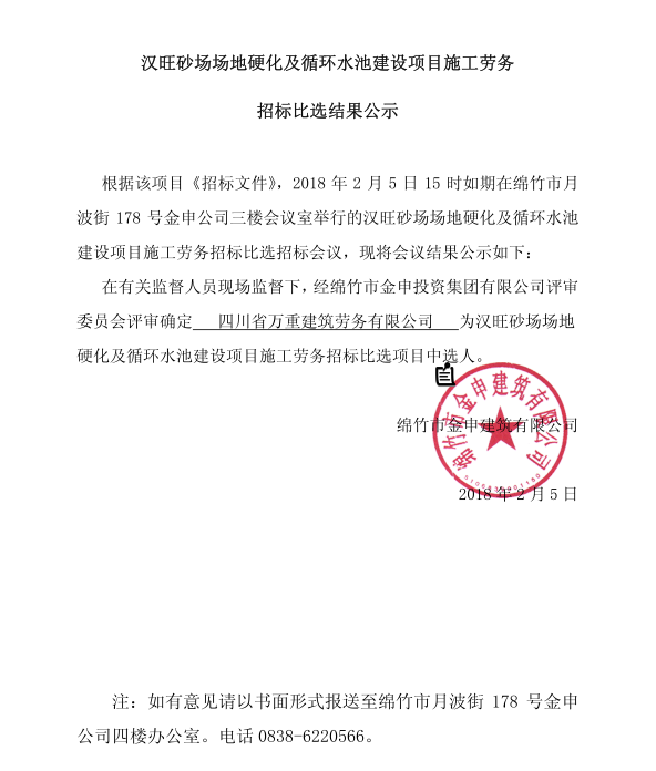 漢旺砂場(chǎng)場(chǎng)地硬化及水池建設施工勞務(wù)招標比選結結果公示