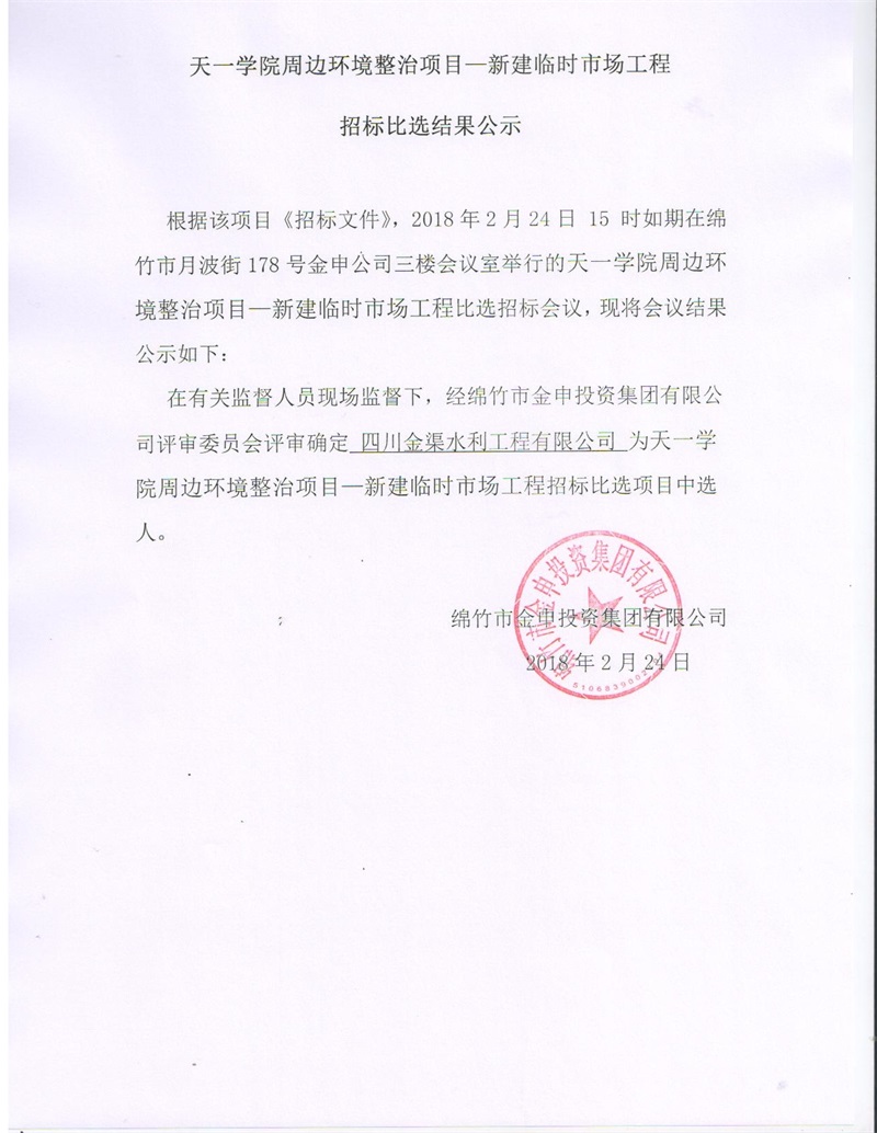 天一學(xué)院周邊環(huán)境整治項目新建市場(chǎng)工程招標比選結果公示