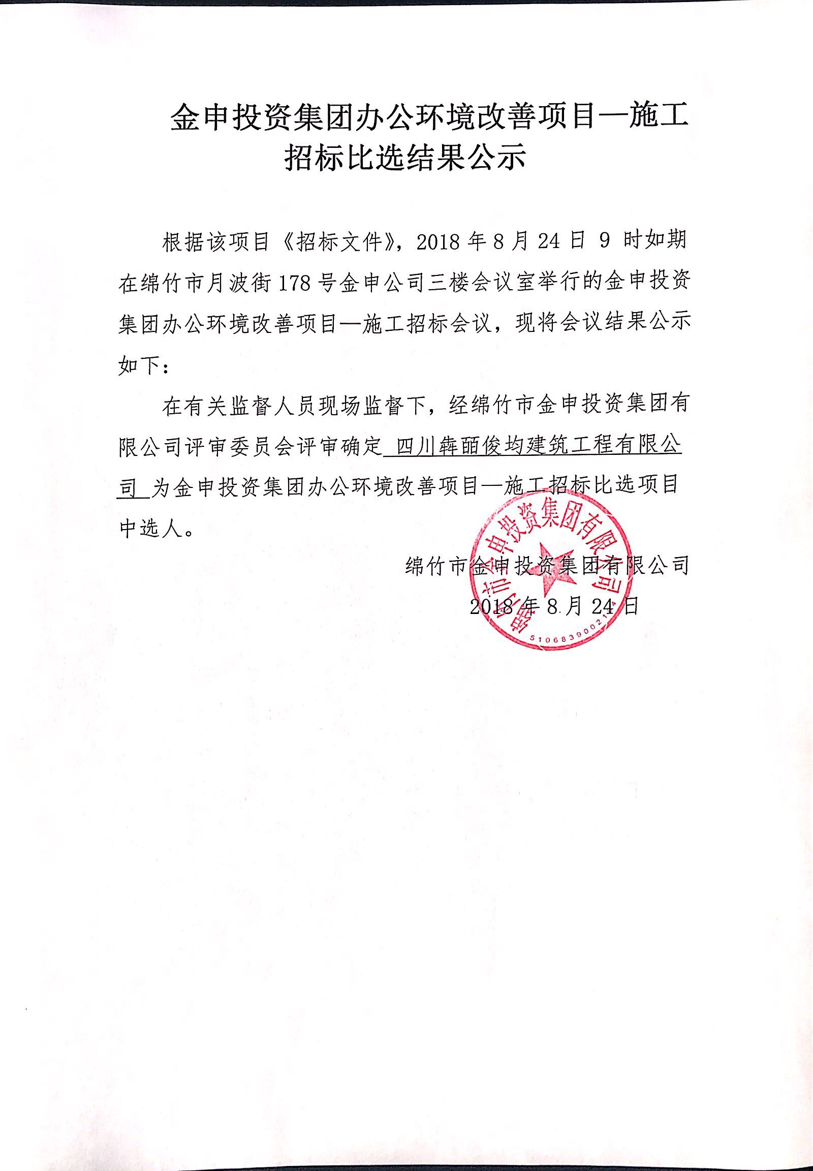 集團辦公環(huán)境改善項目招標比選結果公示