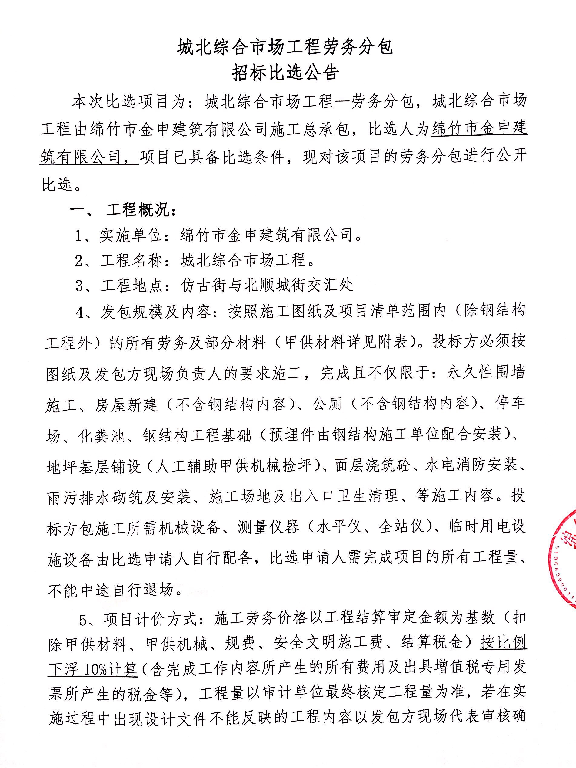 城北綜合市場(chǎng)工程勞務(wù)分包招標比選公告
