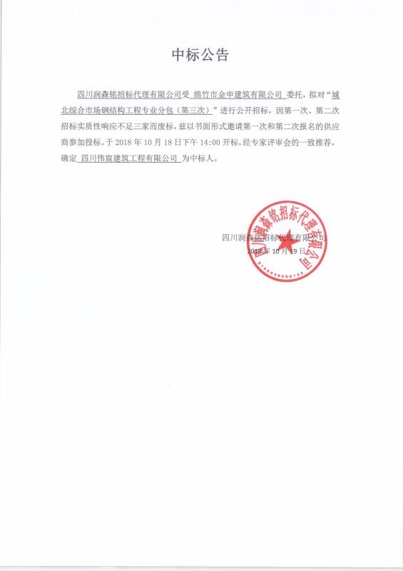 城北綜合市場(chǎng)鋼結構工程專(zhuān)業(yè)分包(第三次)中標公示
