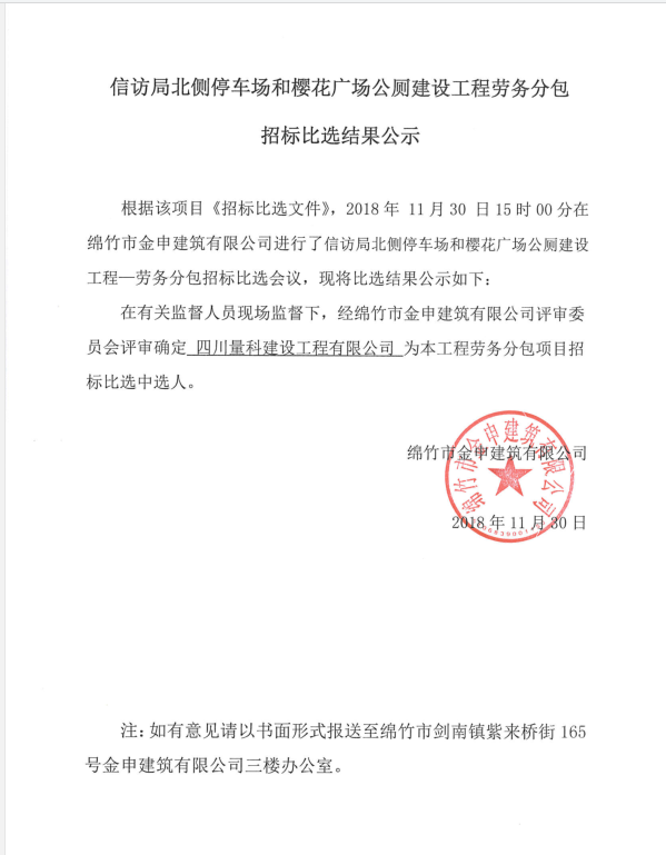 信訪(fǎng)局北側停車(chē)場(chǎng)、櫻花廣場(chǎng)公廁勞務(wù)分包比選結果公示