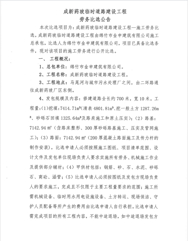 成新藥玻臨時(shí)道路建設工程勞務(wù)比選公告