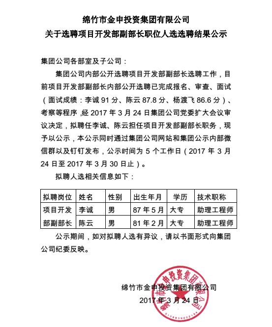金申集團選聘項目開(kāi)發(fā)部副部長(cháng)結果公示