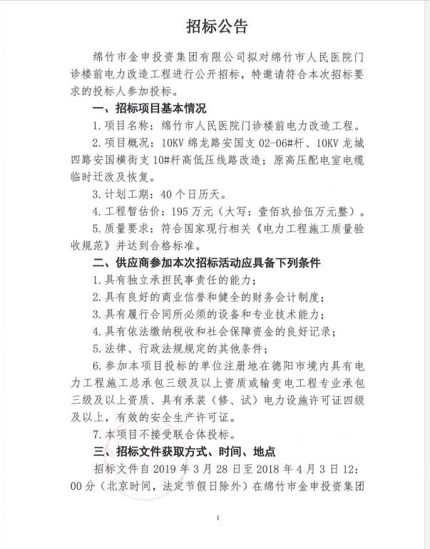 綿竹市人民醫院門(mén)診樓前電力改造工程招標公告