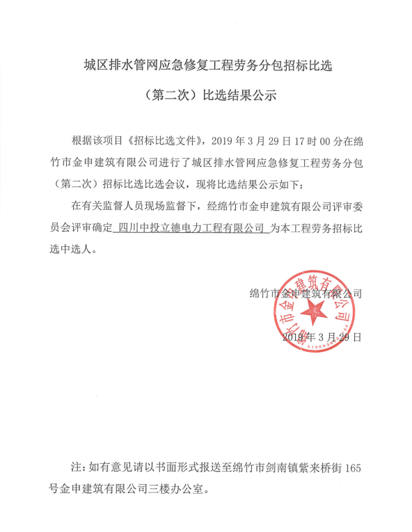 城區排水管網(wǎng)工程勞務(wù)分包(第二次) 比選結果公示