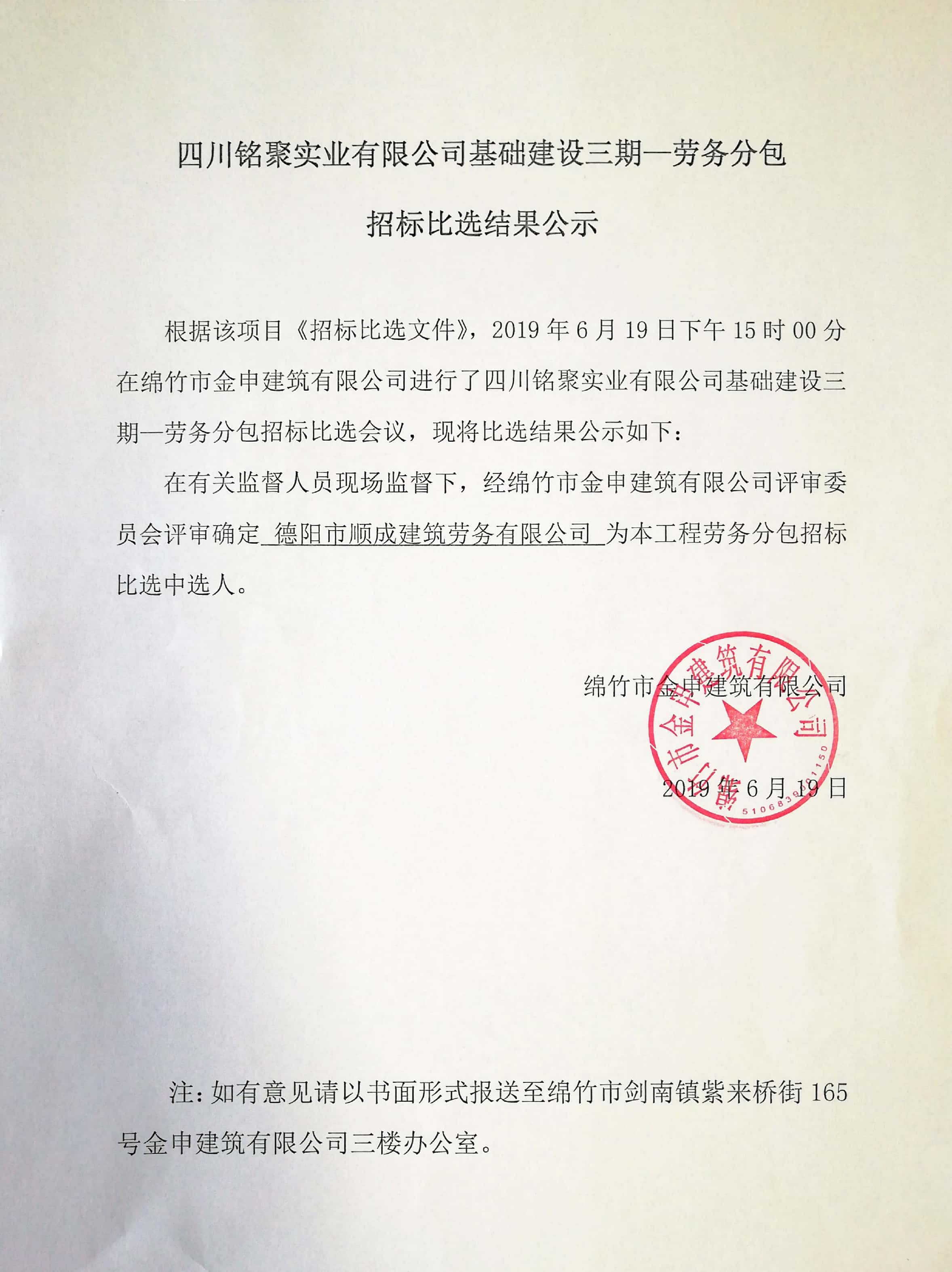 銘聚公司基礎建設三期—勞務(wù)分包招標比選結果公示