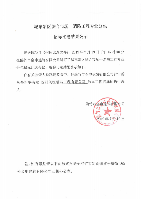 城東市場(chǎng)—消防工程專(zhuān)業(yè)分包比選結果公示