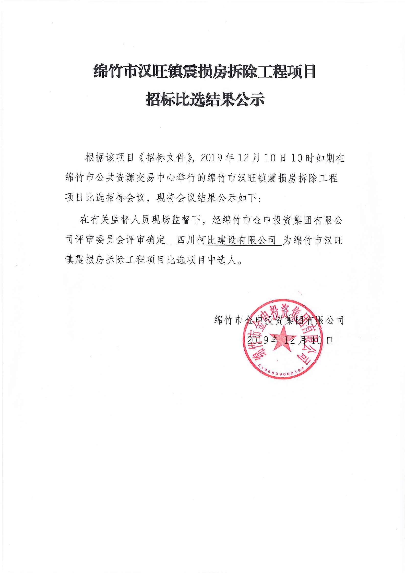 綿竹市漢旺鎮震損房拆除工程項目招標比選結果公示