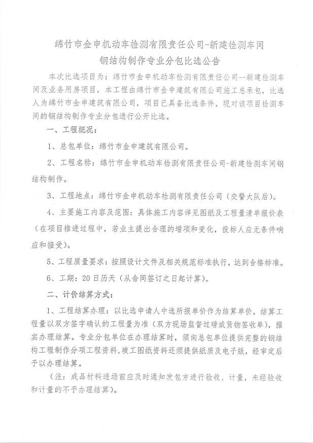 新建檢測車(chē)間鋼結構制作專(zhuān)業(yè)分包比選公告