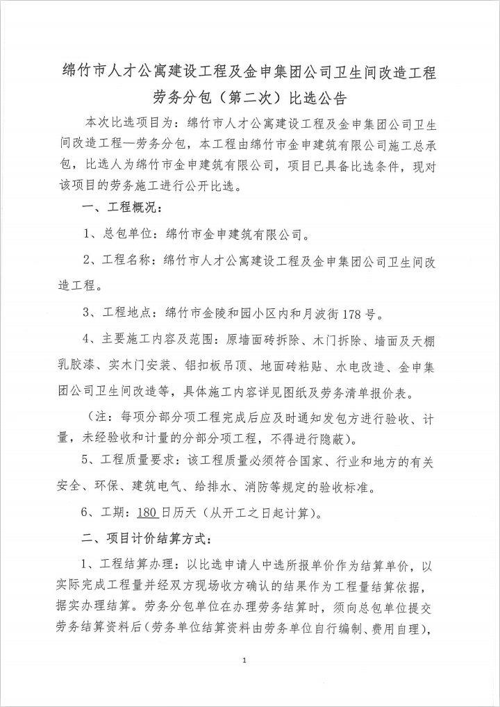 人才公寓 金申衛生間改造工程勞務(wù)分包(第二次)比選公告