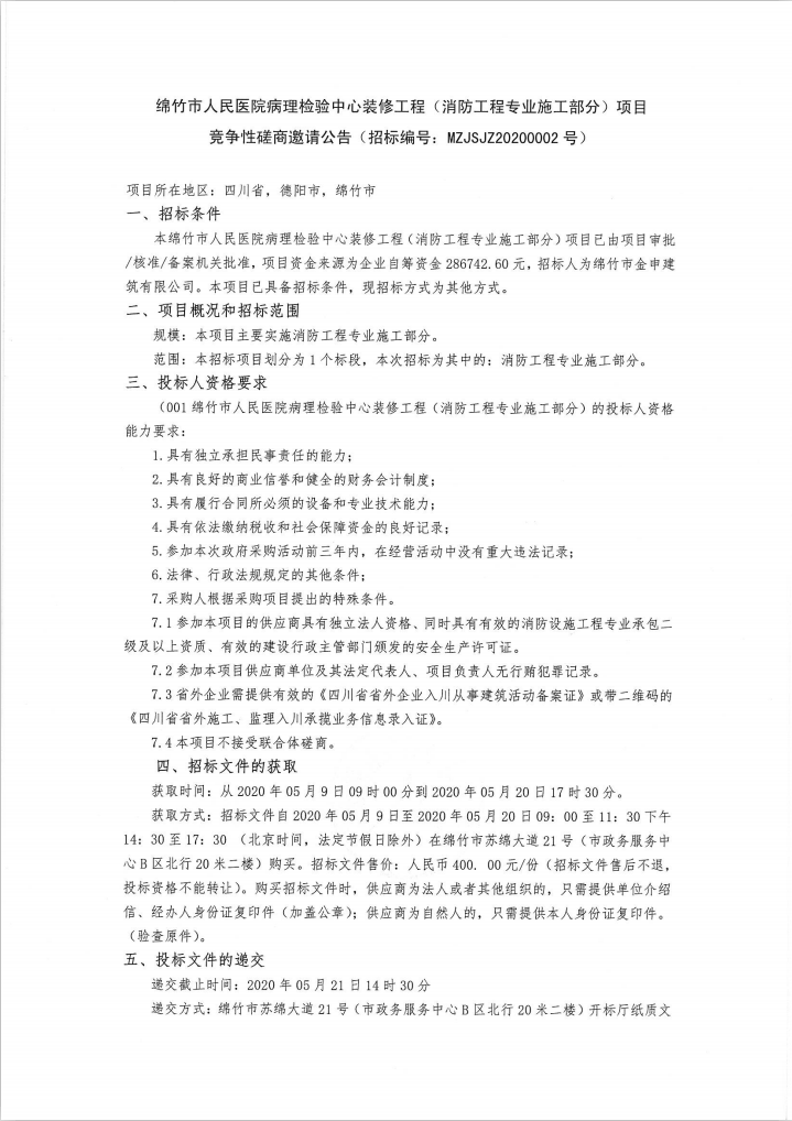 人民醫院病理檢驗中心(消防工程)項目競爭性磋商邀請公告