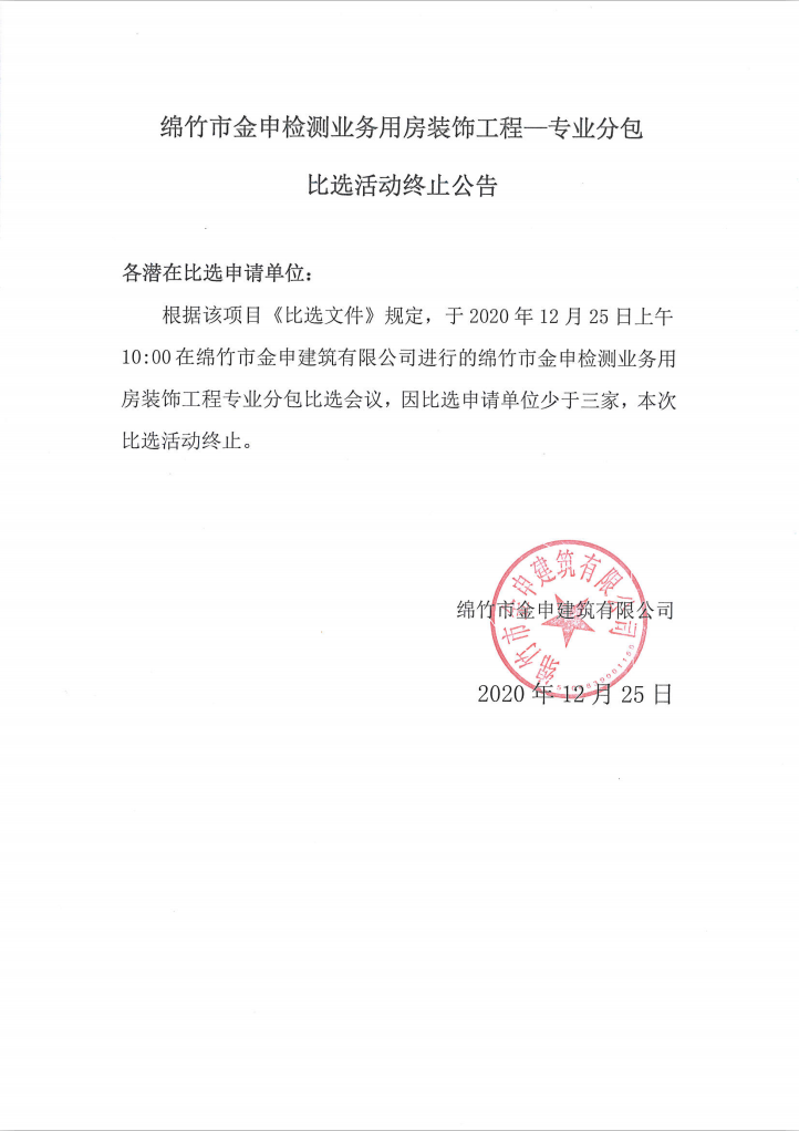 金申檢測業(yè)務(wù)用房裝飾工程——專(zhuān)業(yè)分包比選活動(dòng)終止公告