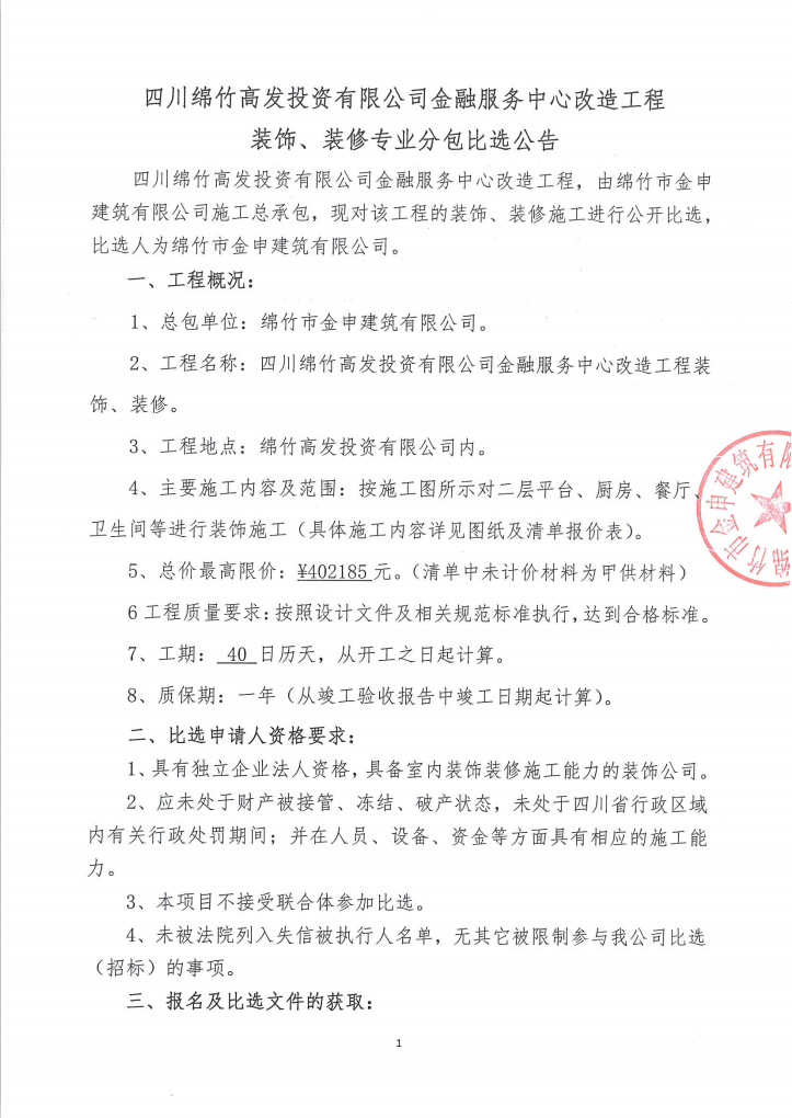 高發(fā)公司金融服務(wù)中心改造工程裝飾 裝修專(zhuān)業(yè)分包比選公告