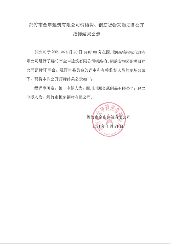鋼結構、鋼筋貨物采購項目招標結果公示