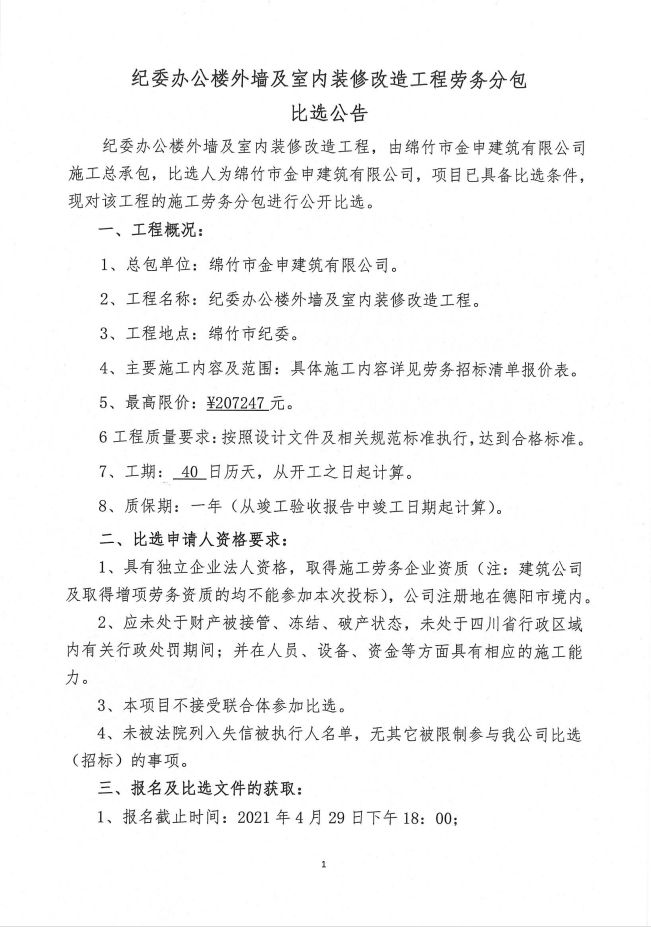 紀委辦公樓外墻及室內裝修改造工程勞務(wù)分包比選公告