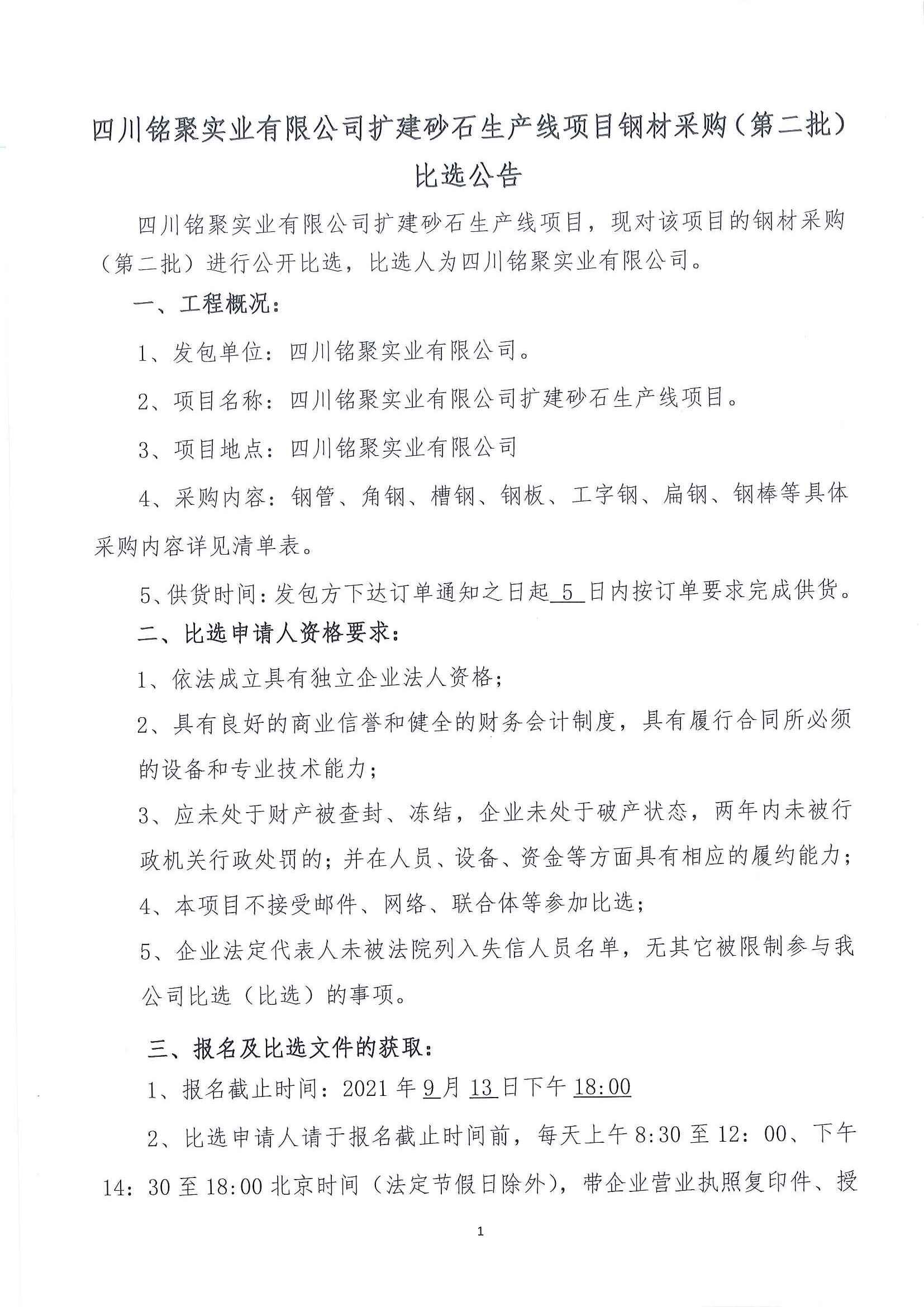 銘聚公司擴建砂石生產(chǎn)線(xiàn)項目鋼材采購(第二批)比選公告