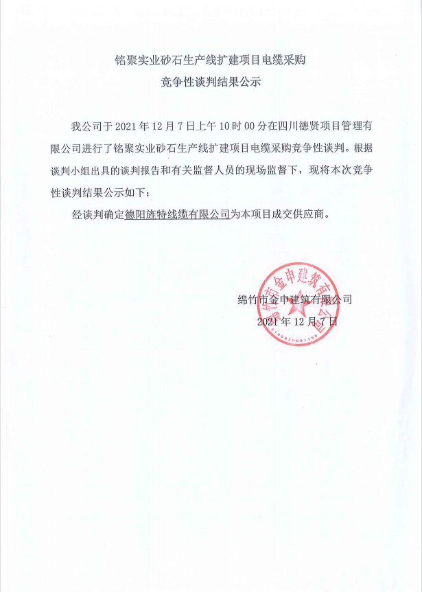 銘聚砂石生產(chǎn)線(xiàn)擴建項目電纜采購談判結果公示