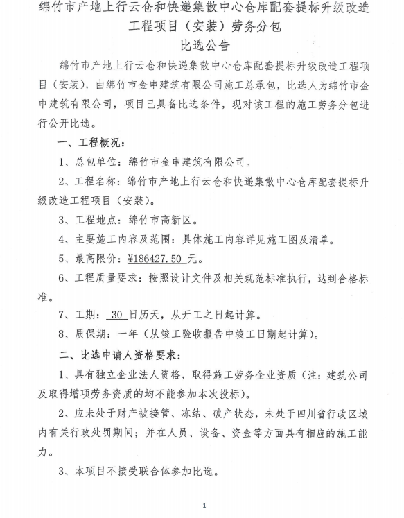 倉庫配套提標升級改造工程項目(安裝)勞務(wù)分包比選公告