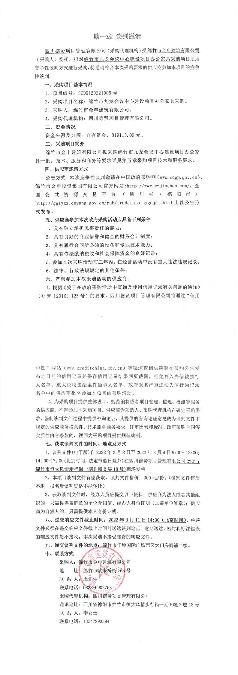綿竹市九龍會(huì )議中心建設項目辦公家具采購談判邀請公告