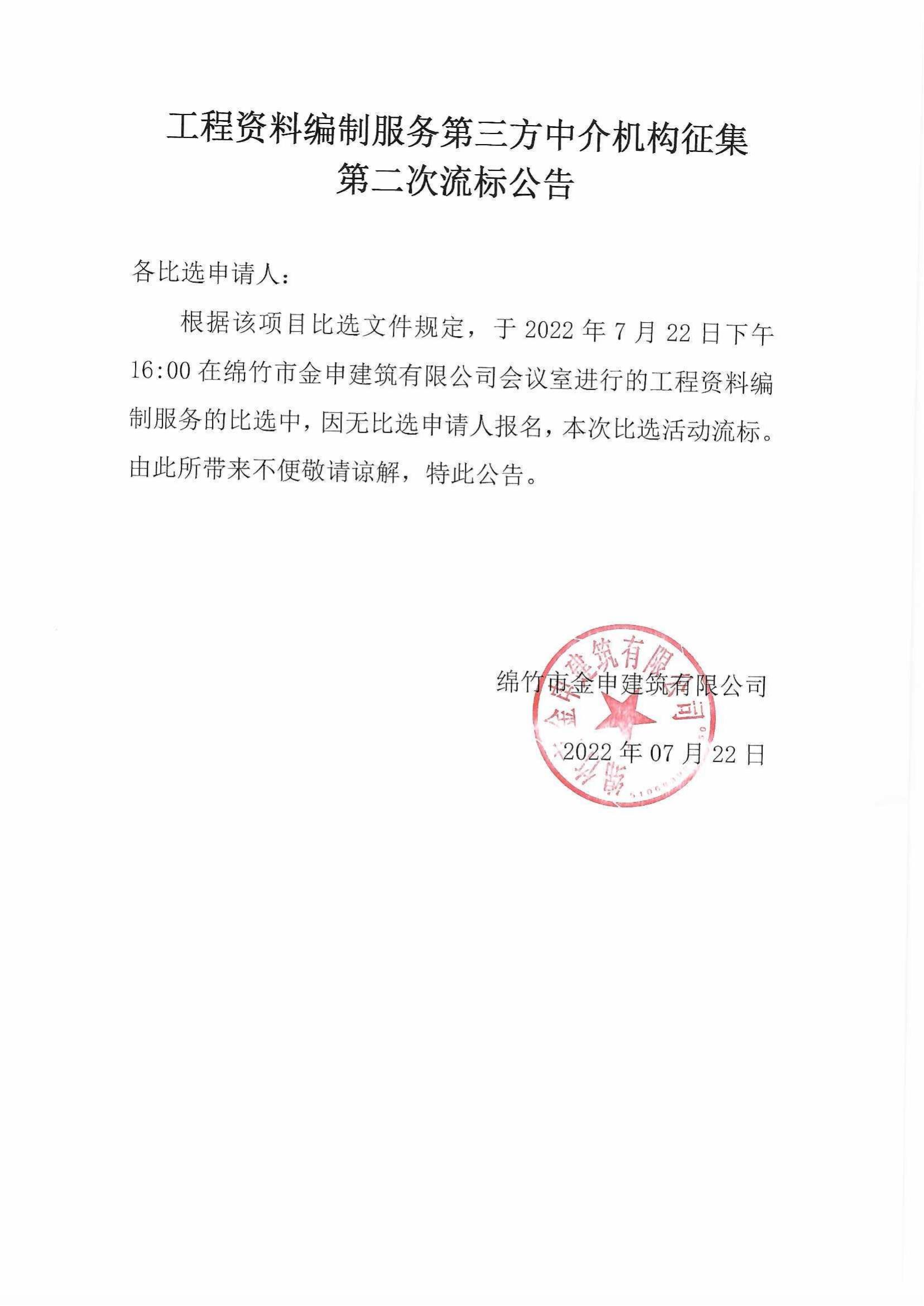 資料編制服務(wù)第三方中介機構征集(第二次)比選流標公告