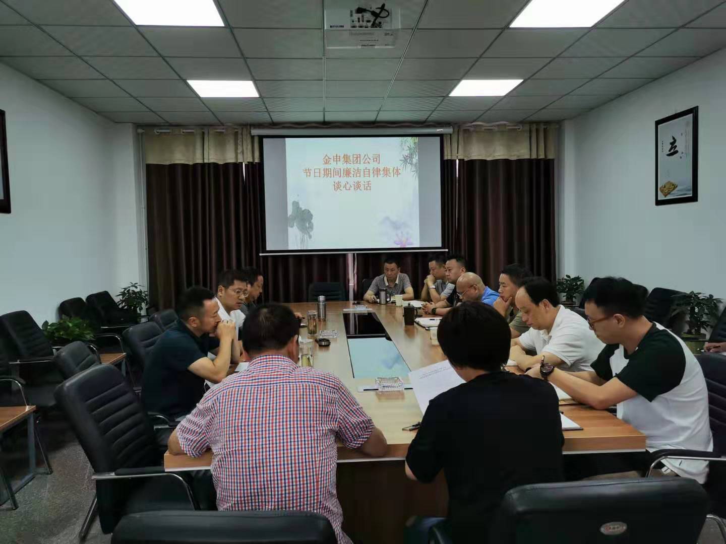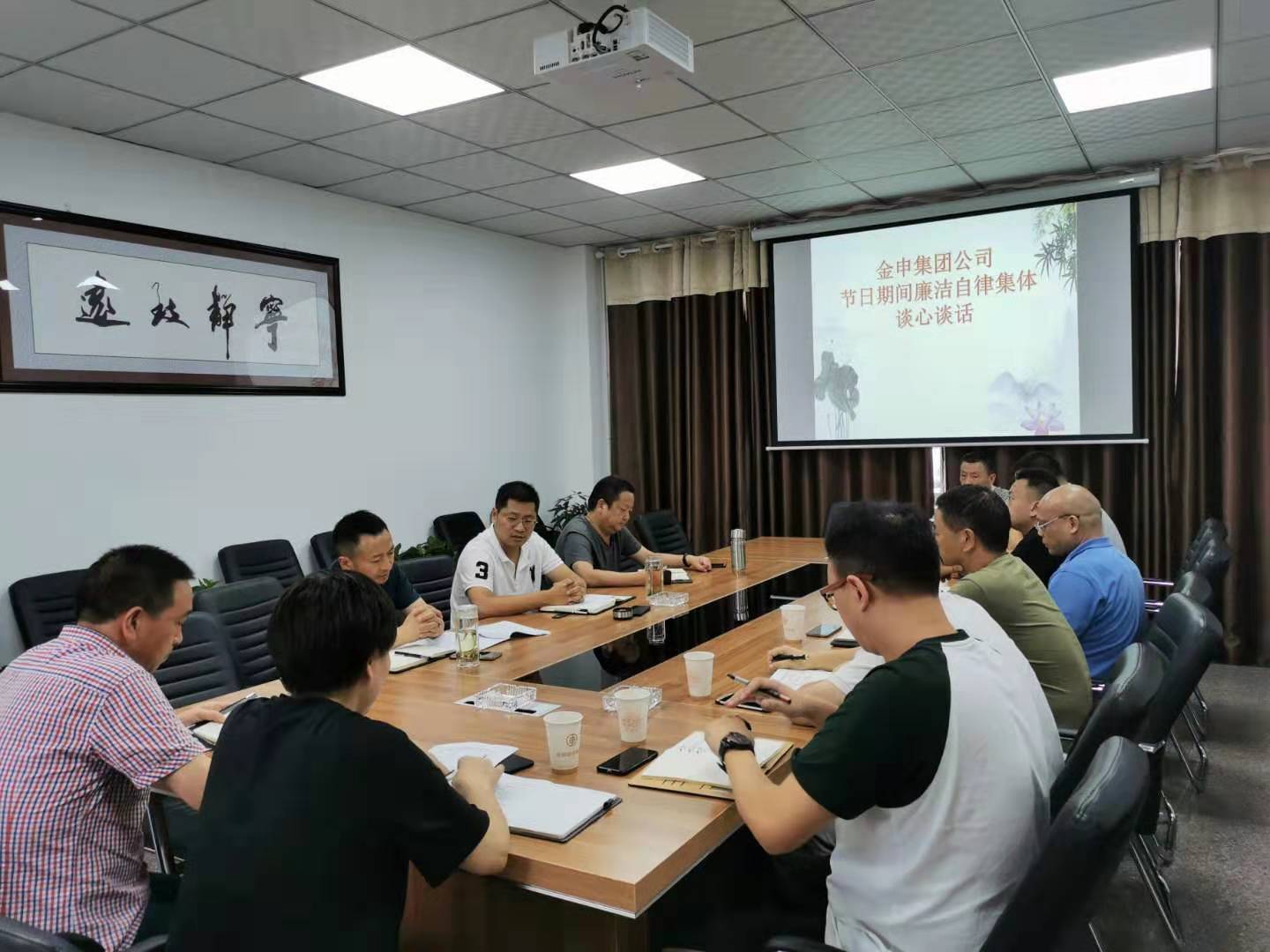 中秋、國慶將至,為深入落實(shí)中央八項規定精神,嚴防“四風(fēng)”反彈回潮,崇廉拒腐,9月11日下午,金申集團公司開(kāi)展節前廉潔自律集體談心談話(huà),集團公司領(lǐng)導班子成員、部門(mén)及子公司負責人、黨小組組長(cháng)參加會(huì )議。